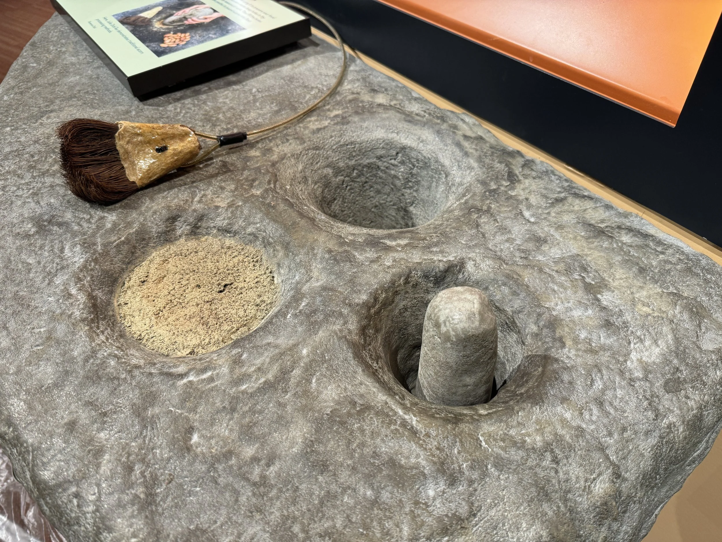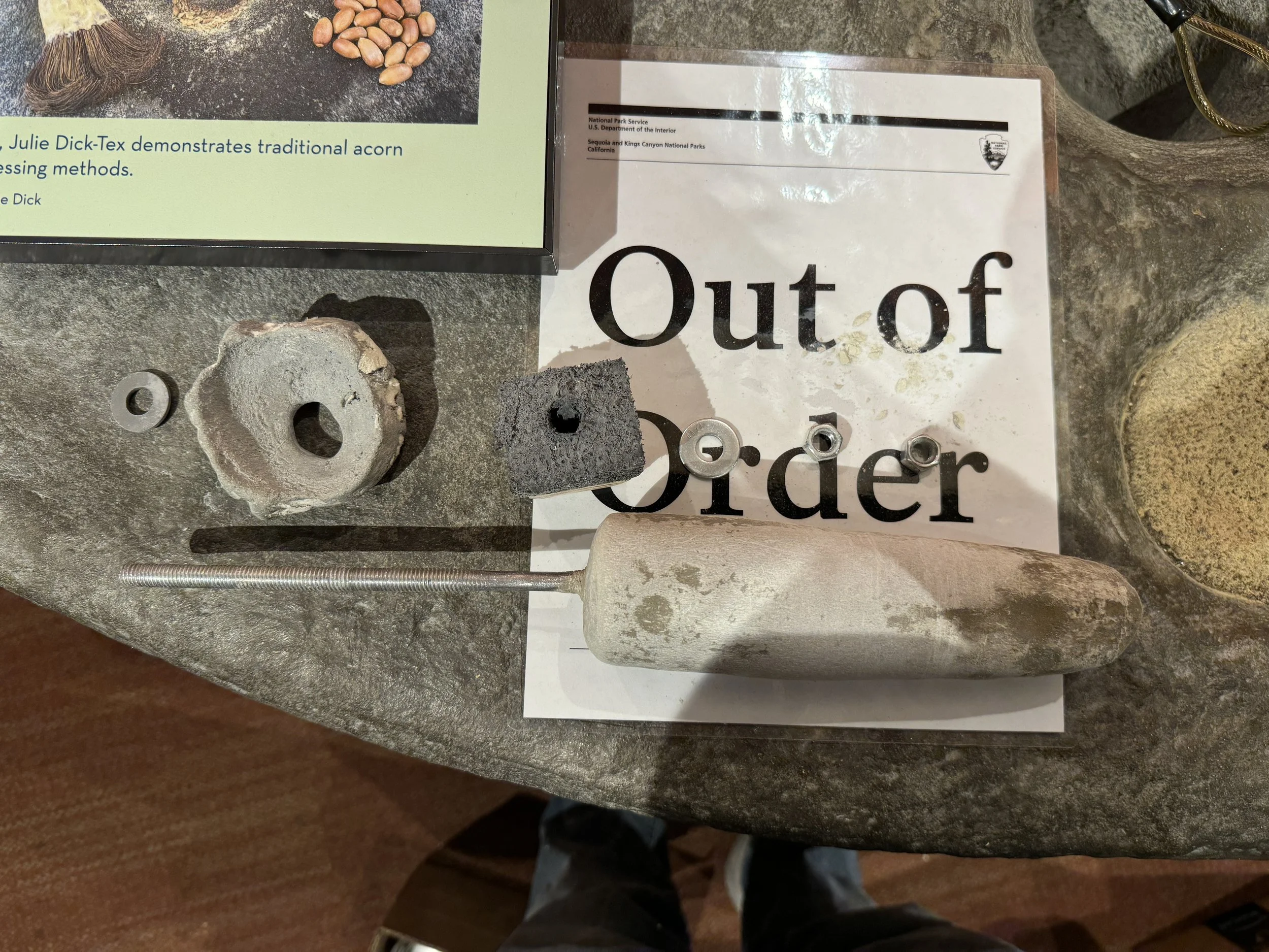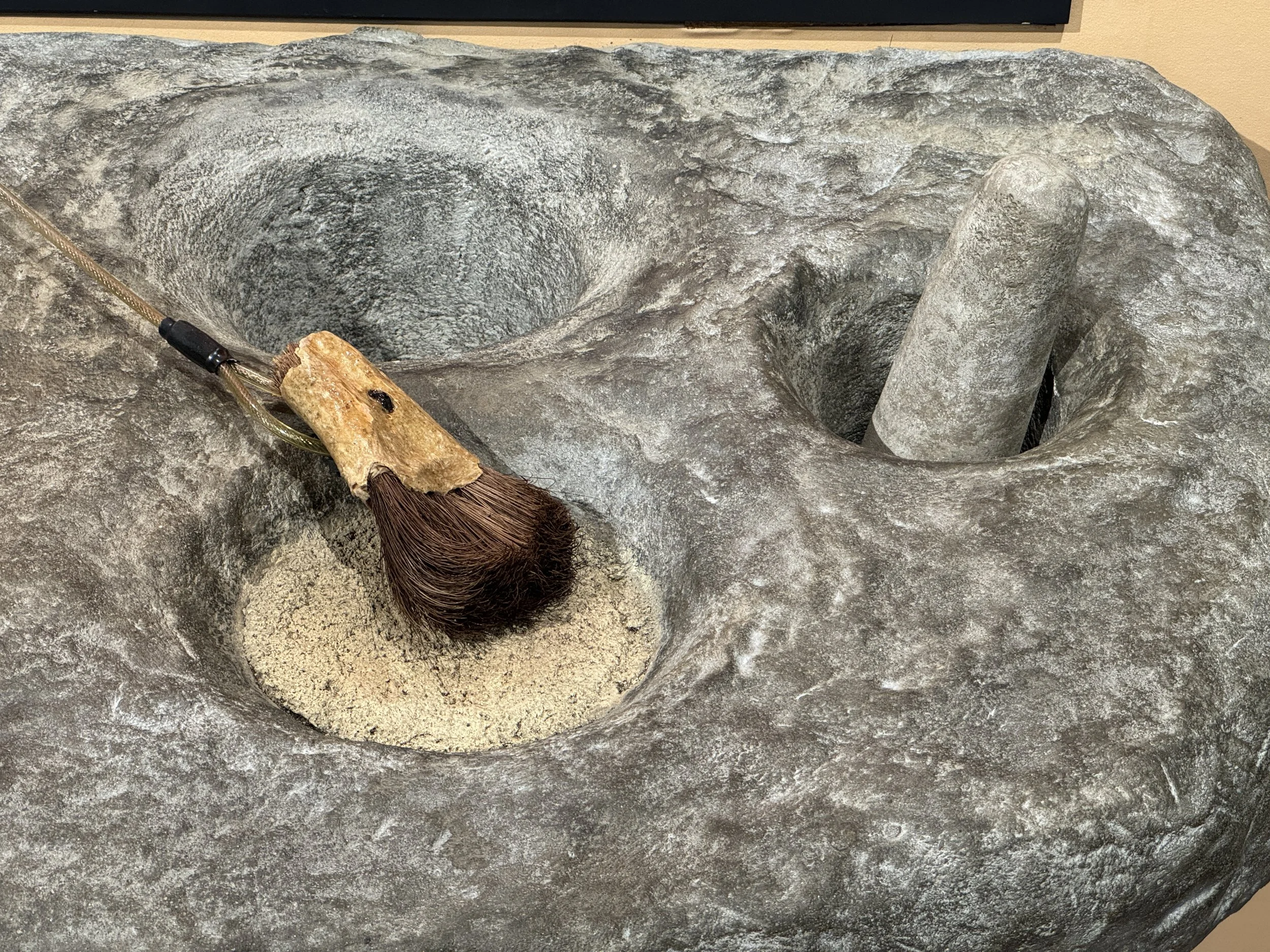 Repaired broken tactile exhibit of a mortar and pestle, which became worn over time and punched through the bottom of the exhibit. Re-plastered hole with new reinforcements, and re-painted worn pestle. Replaced missing soaproot brush. Located at the Lodgepole Visitor Center.
