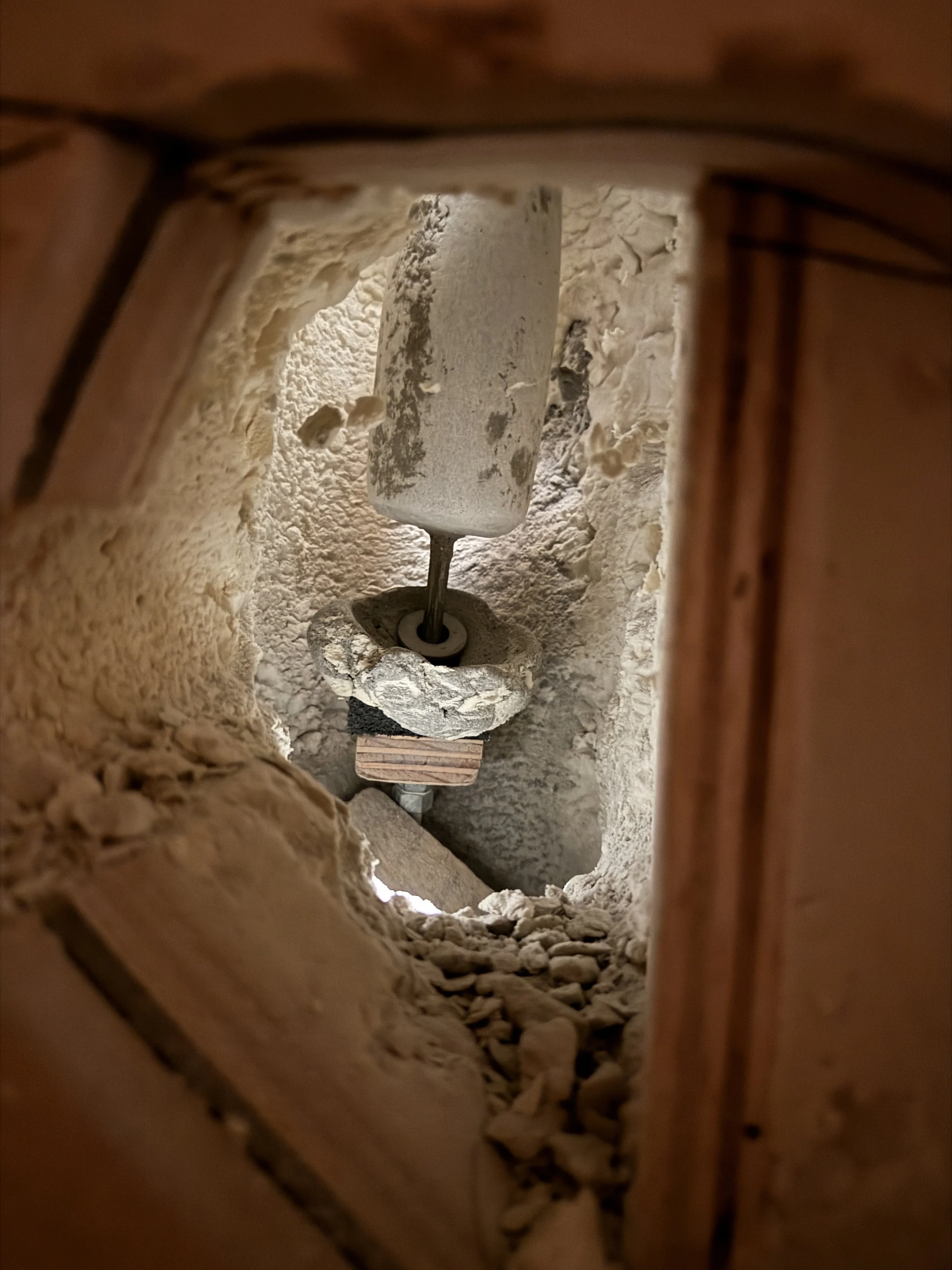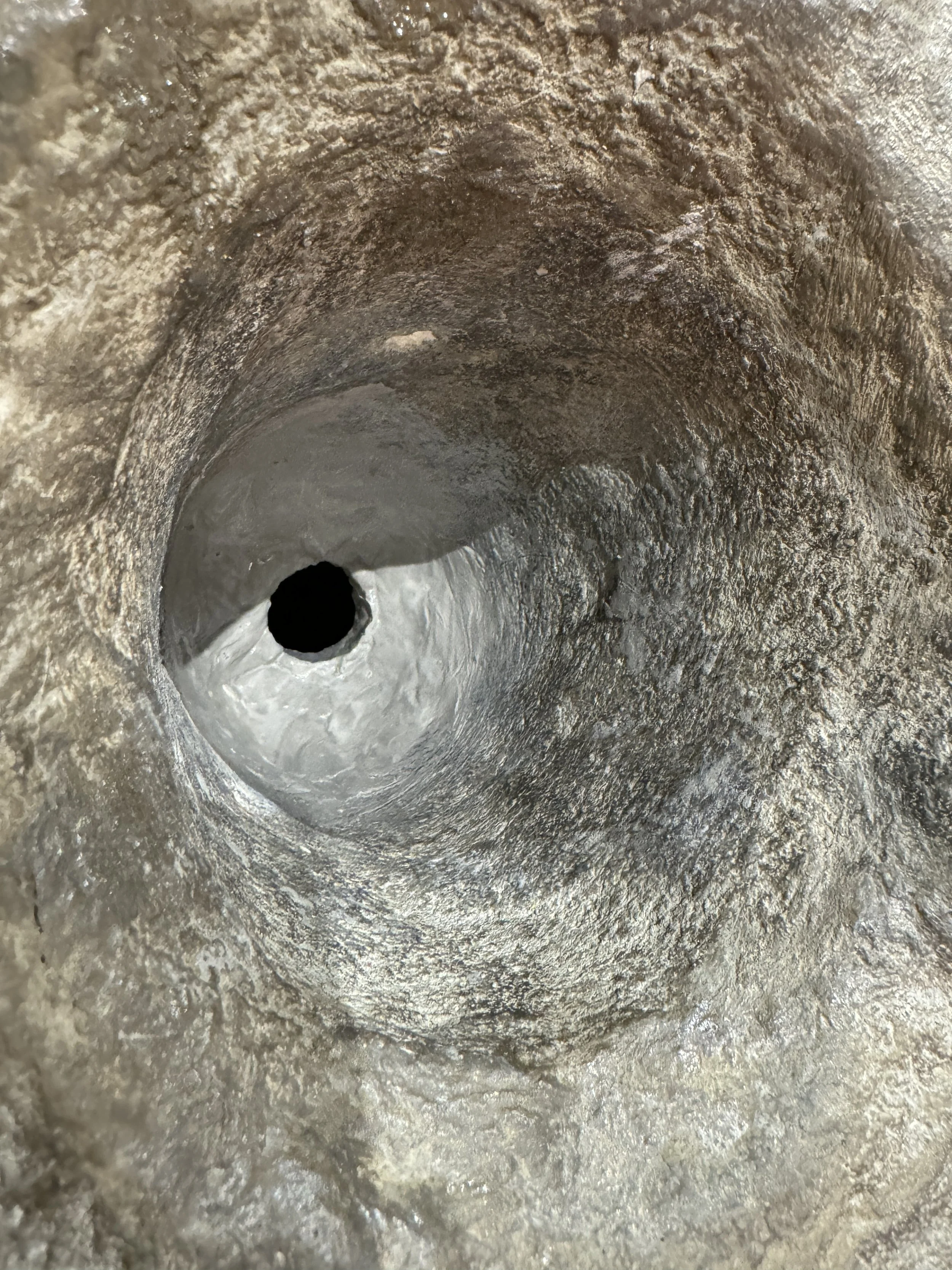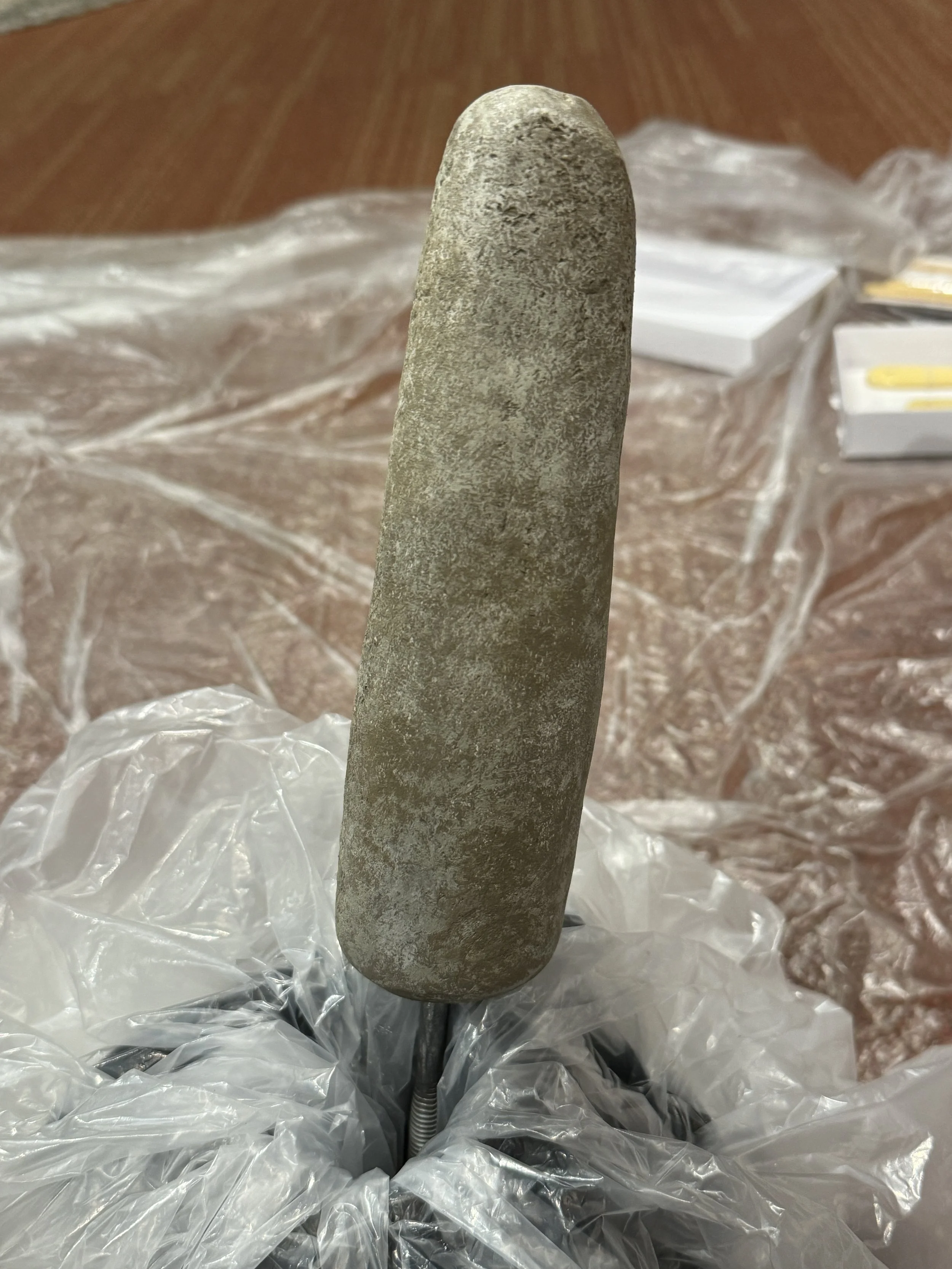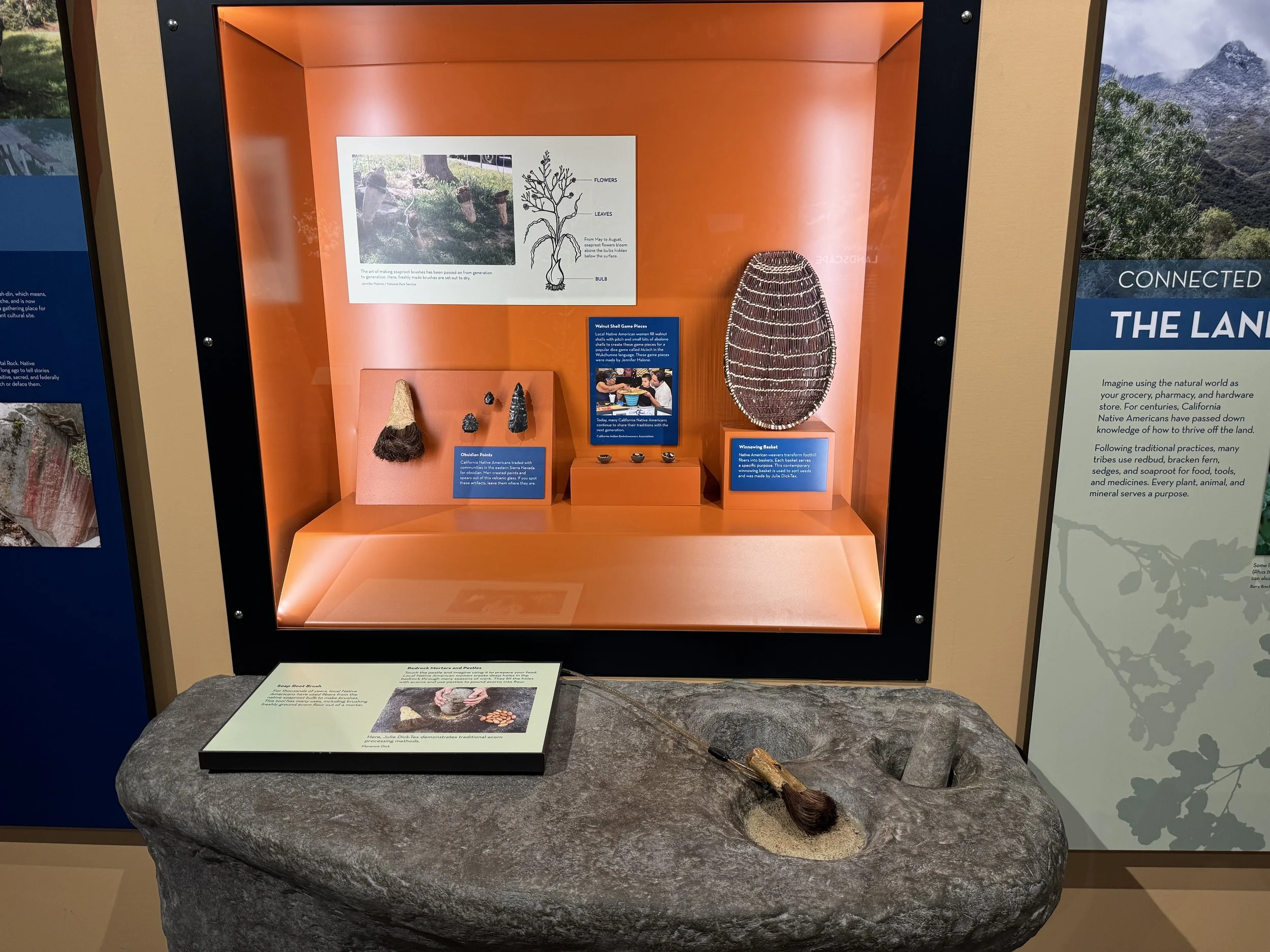 Repaired broken tactile exhibit of a mortar and pestle, which became worn over time and punched through the bottom of the exhibit. Re-plastered hole with new reinforcements, and re-painted worn pestle. Replaced missing soaproot brush. Located at the Lodgepole Visitor Center.